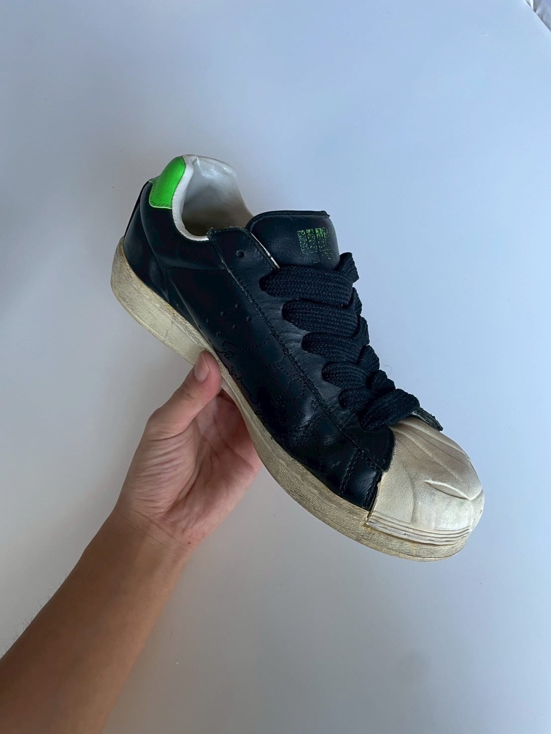 ブラックレザーのアッパーには、UNDERCOVERらしいクラック調のダメージ加工や手書き風のグラフィックが施され、通常のSuperstarとは一線を画す存在感があります。